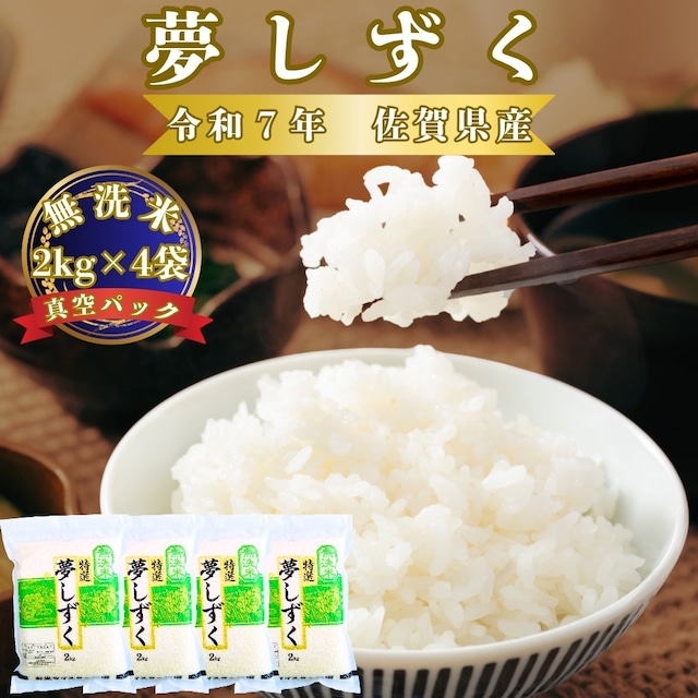 佐賀県限定品種『夢しずく』をお米マイスターが厳選して無洗米にしました!! 通常の無洗米は精米後、機械で洗米(米を水に浸けて洗う作業)をするので、米が割れたり旨味成分を洗い流す事がありますが 『葉隠れ屋』の無洗米は精米後、水を使わず空気の力で表面を丁寧に磨きあげています。 さらに精米したての美味しさを保てるように2㎏ずつ真空パック。 こだわりの【巧味】無洗米です! ※水で洗い流さない無洗米加工をしていますので普通の無洗米に比べて炊飯の際、水が濁る事があります。 ※無洗米用の専用カップを使う必要はありません。 白米用カップで、水加減も白米と同じ分量で炊けます。 賞味期限:未開封(真空状態)なら精米日より180日間は美味しさを保ちます。 内容量:佐賀県産『夢しずく』【無洗米】2㎏×4袋 【送料無料】 配送は宅配便です。